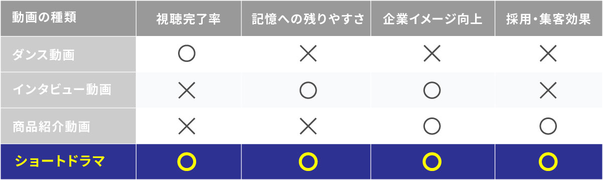 人は情報よりも「ストーリー」を強く記憶します。感情移入が起きやすいショートドラマは、通常の情報の22倍も記憶に残りやすく、企業のメッセージや魅力を長期間覚えてもらうことができます。