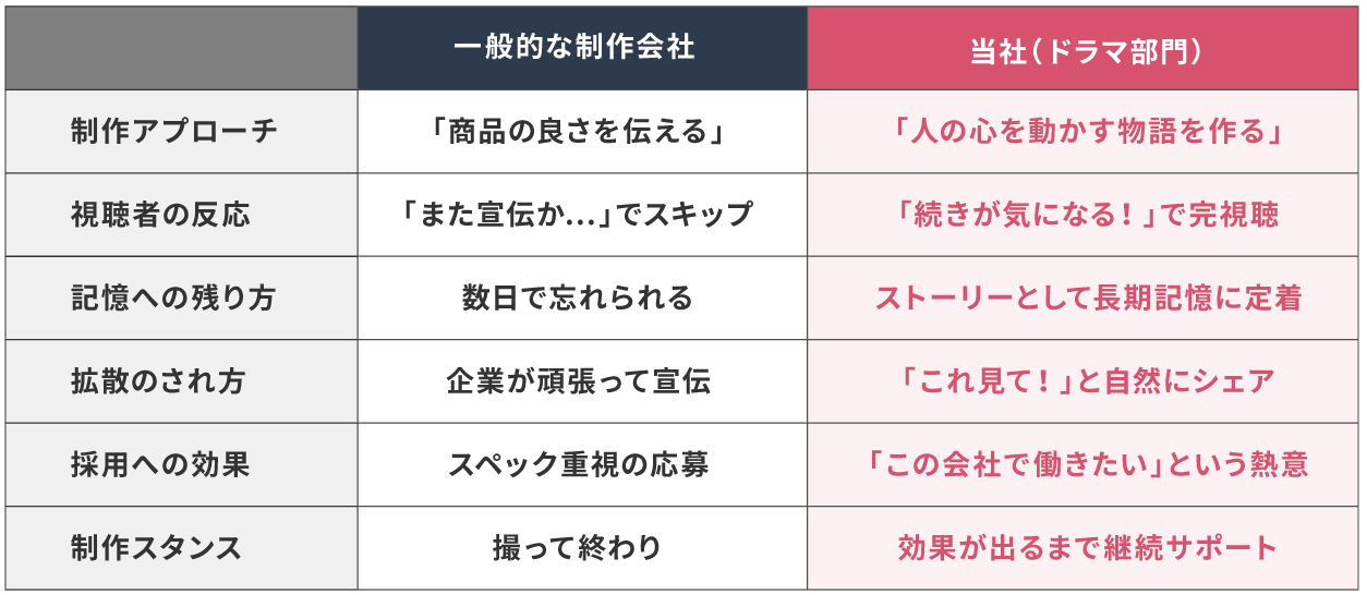 当社のドラマ制作は、人の心を動かす物語設計で長期的に記憶に残り、自然なシェアや採用・集客につながります。プロの演者によるリアルな演出と、配信後の継続的な